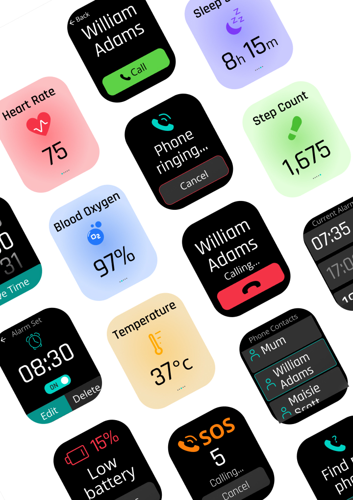 With a clear understanding of our users, we began by designing the remote care smartwatch interface. Our process involved multiple rounds of iteration, with user feedback gathered at every stage to guide improvements. Interactive prototypes were created in Figma, enabling rapid testing and refinement. We focused on ease of use, clear visuals with minimal interaction. Features like SOS alert, medication reminders and incoming calls were also a priority for the watch as well as displaying the users health information.