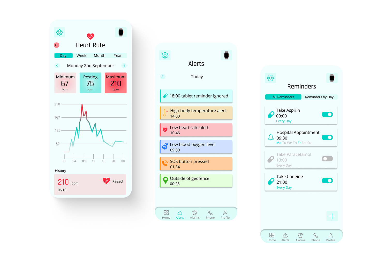 The result is a clear and simple wearable remote care watch paired with a seamless, customisable app that provides carers with real-time updates on the wearer’s health. The watch includes three adaptable faces designed to meet different user needs, featuring large buttons, readable text, and minimal navigation to access essential information quickly. We built fully interactive prototypes for both the watch and app, enabling a smooth handoff to the development team.